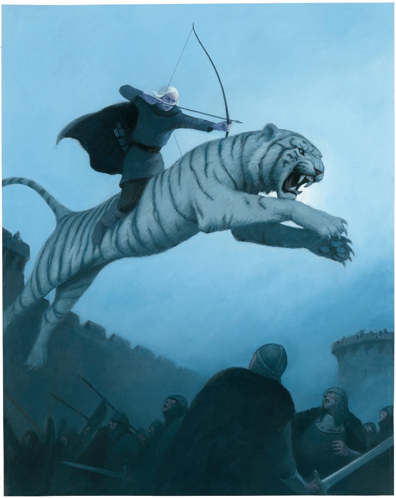 Le texte et les images nous emportent dans un monde fantastique, tout en nuances de gris et de bleu, peuplés de somptueux animaux et d’êtres humains guerriers à l’allure très nordique. L’amitié, le courage et l’audace sont mis en avant dans cette belle aventure qui nous hante encore longtemps après avoir refermé le livre.