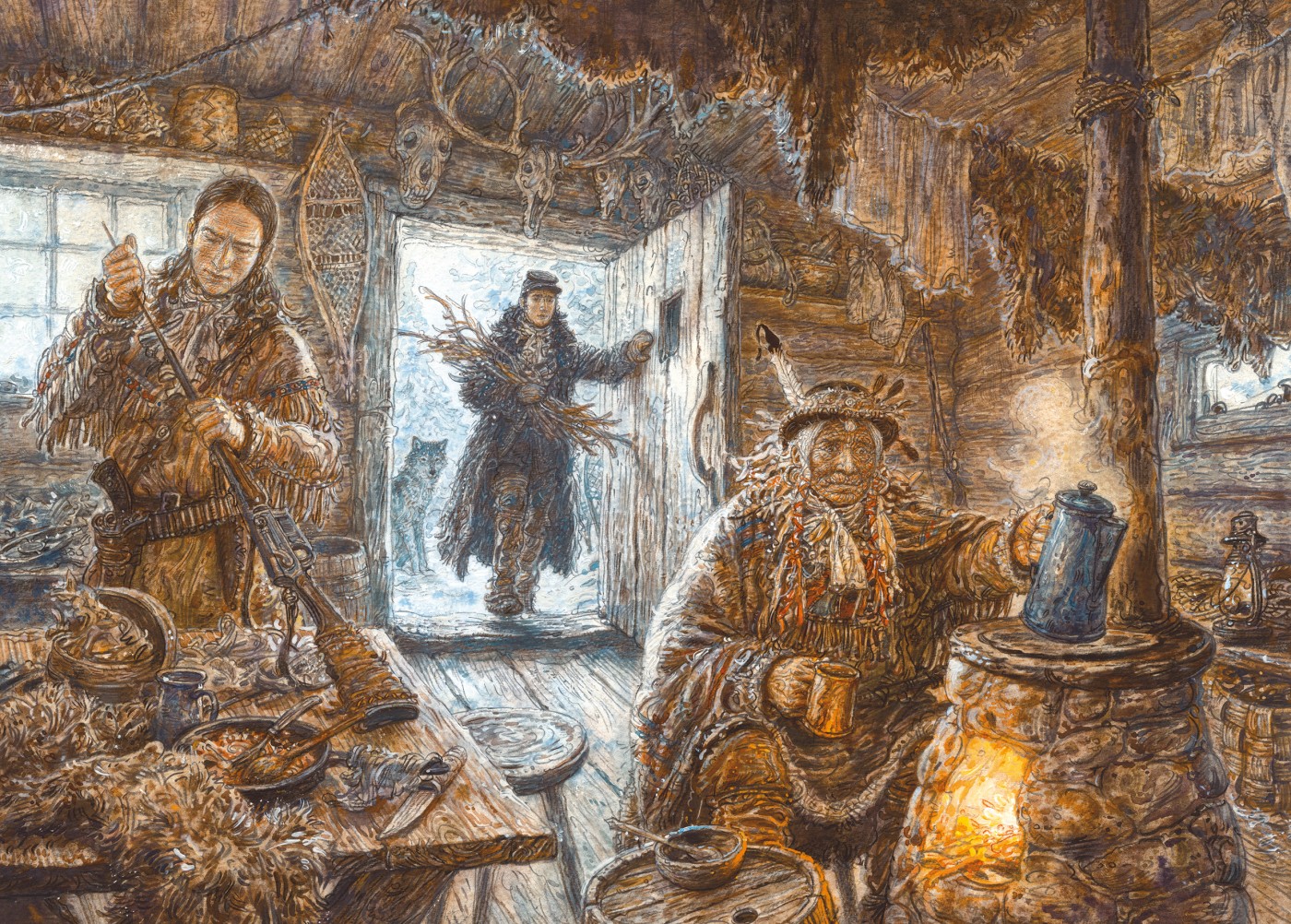 « Les chasseurs de loups » ne fait pas exception à la règle : les aventures du jeune Roderick, ses liens avec ses frères chasseurs et la lutte contre les Indiens de la tribu Woonga sont somptueusement illustrées par Anton Lomaev et enrichissent l’histoire d’un souffle épique incroyable. Me restera longtemps en mémoire, en particulier, la double page illustrant l’arrivée de Rod et ses deux compagnons indiens dans une cabane au milieu de la montagne.