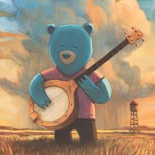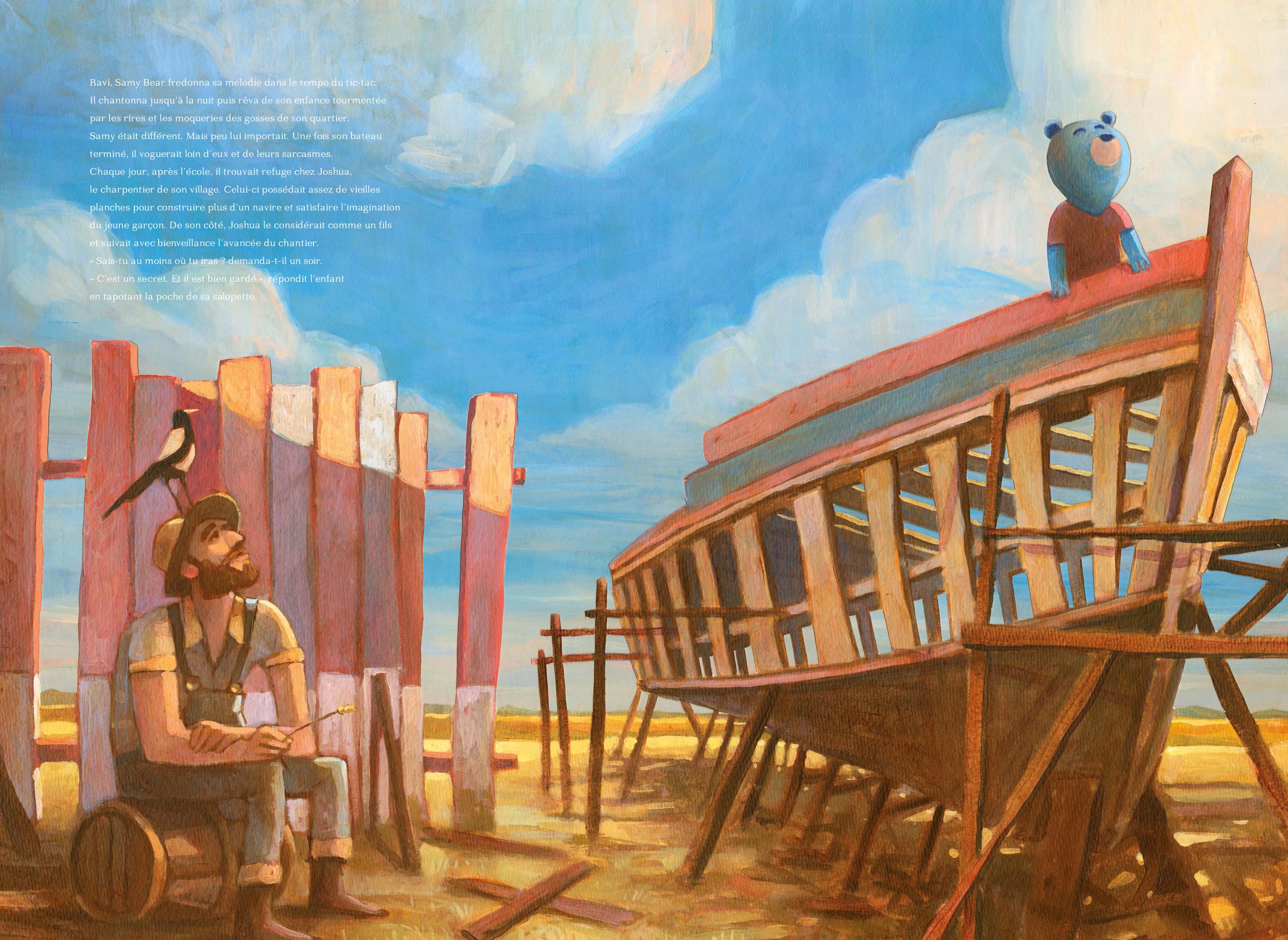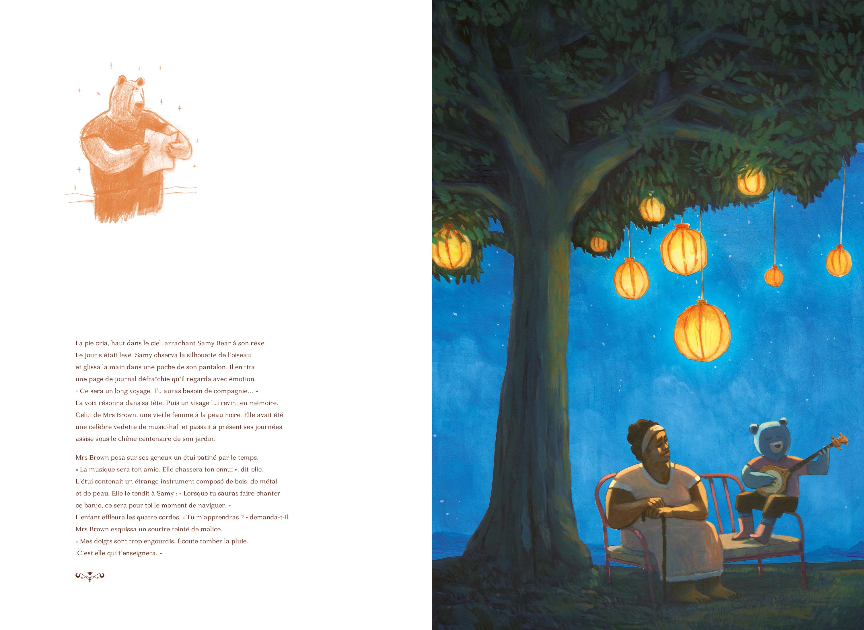 « Cela faisait bien longtemps que Samy Bear avait oublié la raison de son voyage« … Bien longtemps qu’il avait reçu de Mrs Brown un étrange instrument composé de bois, de métal et de peau. Bien longtemps que Joshua l’avait confié à a compagnie d’une pie noire. Bien longtemps que Samy avait appris à maîtriser son instrument et à faire tomber la pluie.