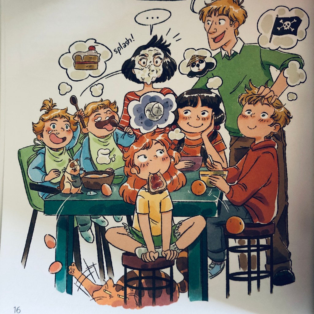 Ce n’est plus Ariane Delrieu qui croque les visages des sympathiques personnages mais Marine Gosselin et le moins qu’on puisse dire, c’est que c’est une belle réussite ! Les couleurs sont vives, chatoyantes et le trait à la fois doux et dynamique ! Minuscule bémol de mon côté (mais qui n’en était pas un pour mes enfants, à qui la BD s’adresse principalement !) les éclats de rire façon manga.