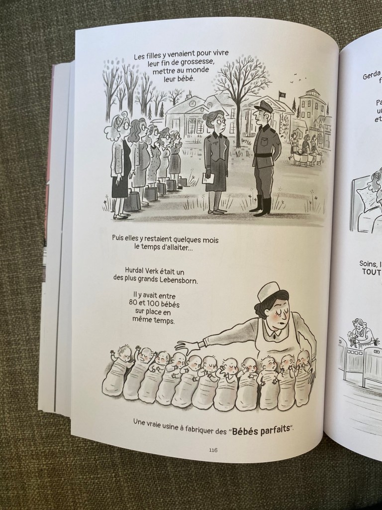 En l’occurrence, l’existence des Lebensborn, ces maternités conçues pour faire naître la génération suivante d’aryens, nés de pères soldats allemands encouragés à procréer avec des jeunes filles « racialement valables » : blondes, aux yeux bleus et évidemment sans la moindre trace de juif dans la famille.