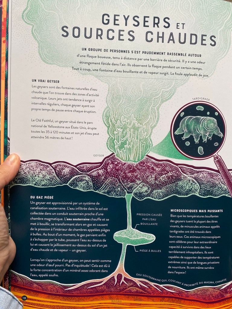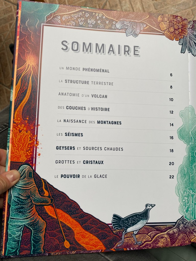 En 16 chapitres présentés chaque fois sur une double page, Jennifer N. R. Smith nous explique un « incroyable phénomène de la Terre » : comment sont nées les montagnes ? Comment se forment les volcans ? Quel rôle joue la glace sur la planète ? Qu’est-ce qu’un geyser ?