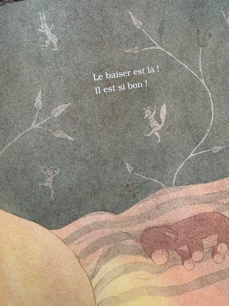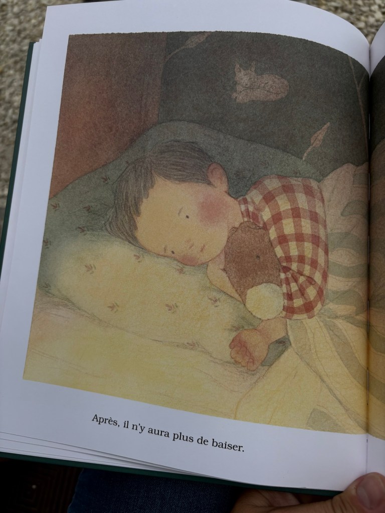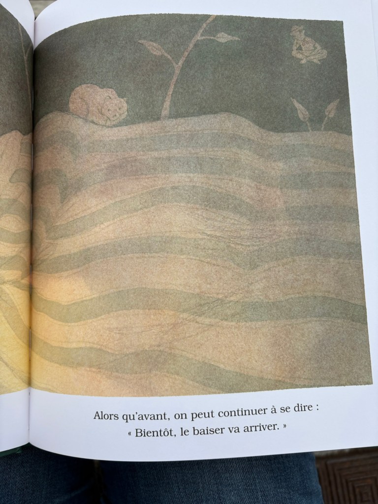 Tout part de ce baiser qu’un petit garçon – qu’on imagine s’être couché de bonne heure – attend patiemment. Maman est en bas, avec les invités. Quand arrivera-t-elle ? Quand viendra-t-elle déposer cette précieuse preuve d’amour ? Et si, finalement, l’attente du baiser était encore plus douce que le baiser lui-même ?